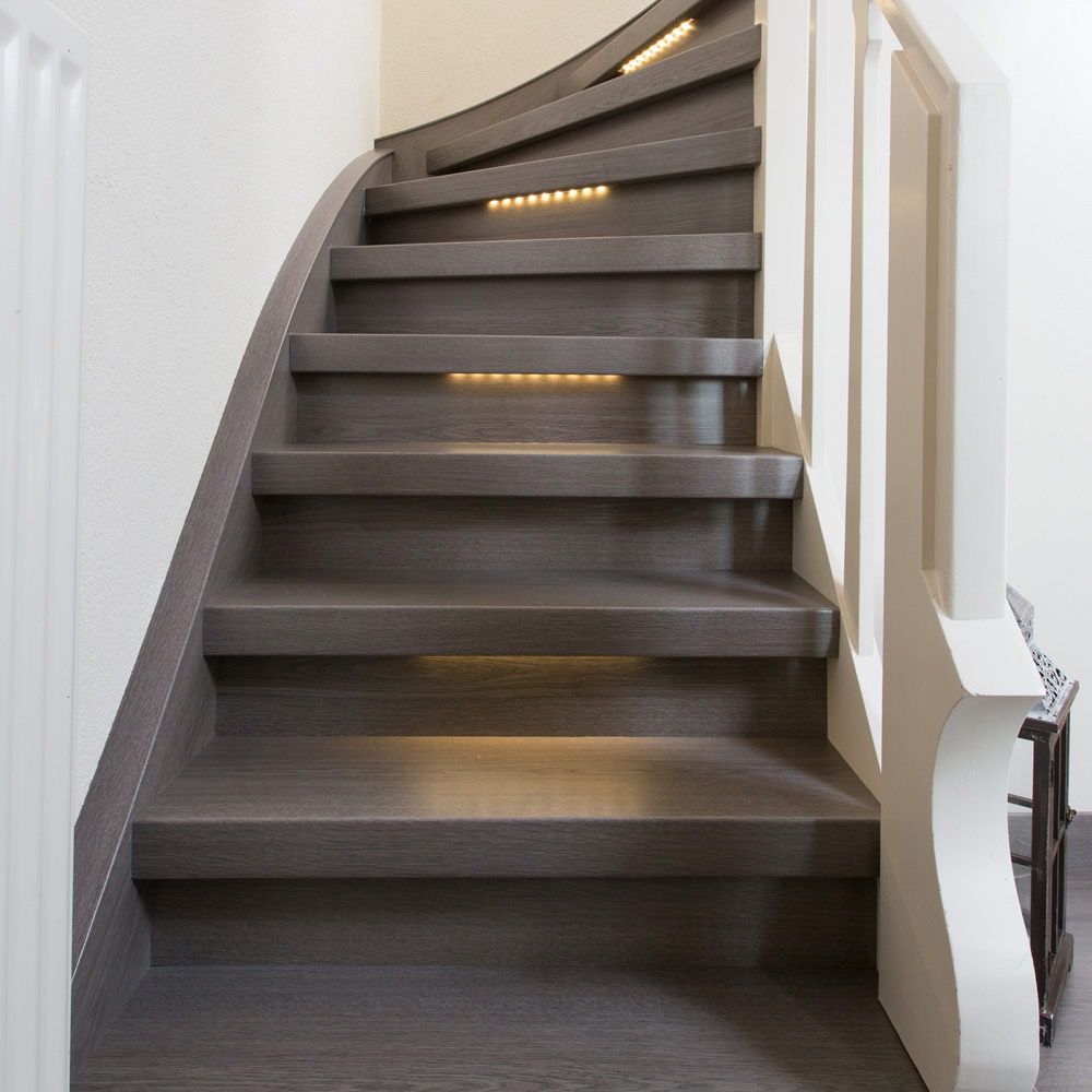 Voor het bekleden van uw dichte trap van hout, beton of steen zijn overzettreden van HPL, Vinyl of PVC, houten overzettreden of treden met een natuurstenen uitstraling geschikt. Welke overzettreden hebben uw voorkeur? U kunt een keuze maken uit onze uiteenlopende decors tijdens het eerste adviesgesprek. Een dichte trap renoveren wij met overzettreden, onderlatten en stootborden van HPL, massief hout of dunsteen. Bovendien is het ook mogelijk om uw trap nog mooier tot zijn recht te laten komen met led-verlichting, een trapleuning en eventueel een balustrade.