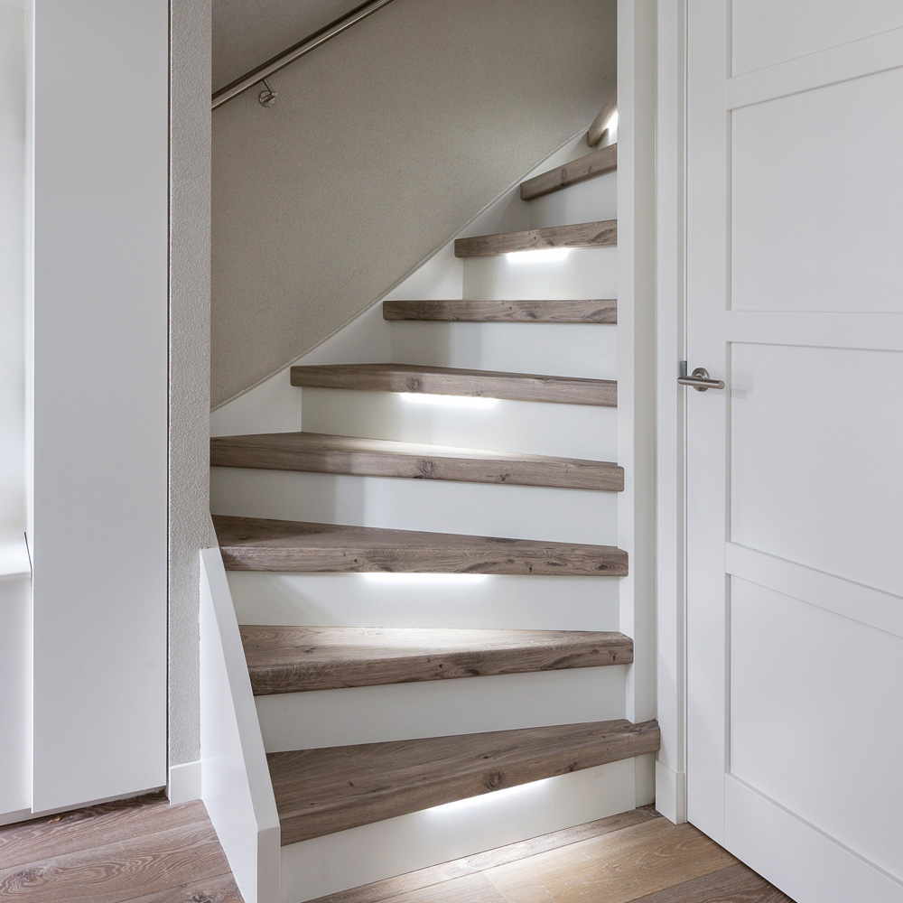 Een andere optie waar steeds meer mensen voor kiezen bij de afwerking van hun nieuwbouw trap, is het verwerken van LED-verlichting. Dat kan aan de onderkant van de traptreden, in de zijkant van de trap of zelfs in de trapleuning. De verlichting kan worden geactiveerd door middel van een bewegingssensor. Uw trap wordt daarmee een sfeervolle bron van licht, maar het komt bovendien de veiligheid bij gebruik in het donker ten goede.